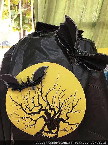 利用黑色大垃圾袋沿著折線稍微展開,拉成斗篷造型(沒剪開或剪破,順著線條展開拉平即可),接著把裁好的月亮、蝙蝠用保麗龍膠固定,最後再用長尾夾把垃圾袋固定在肩膀上就完成啦!